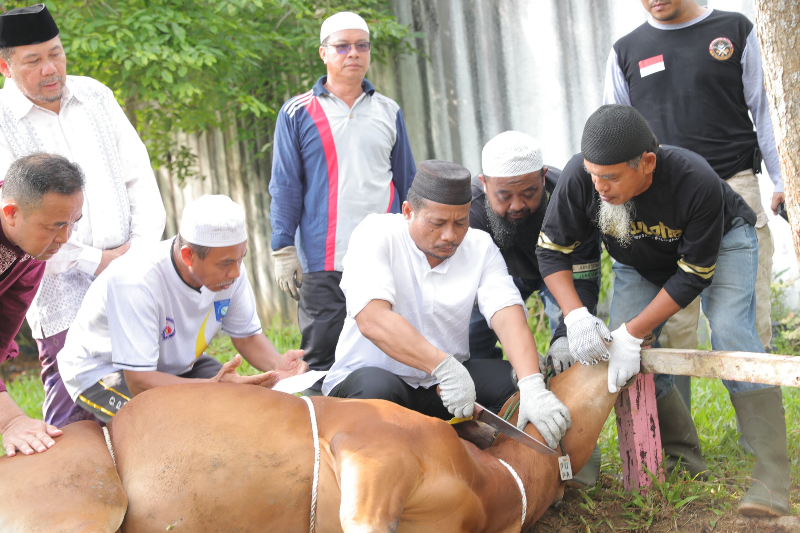 Di bawah bimbingan Juru Sembelih Halal (Juleha) Provinsi Kepulauan Bangka Belitung, Plh Pj Gubernur Babel, Fery Afriyanto menyembelih sapi kurban dengan tata cara penyembelihan hewan kurban.