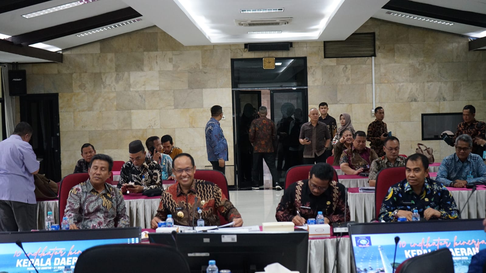 Pj. Gubernur Sugito yang didampingi Sekretaris Daerah (Sekda) Pemerintah Provinsi Kepulauan Bangka Belitung (Pemprov. Kep. Babel) serta Kepala Perangkat Daerah menyampaikan paparan yang melingkup indikator kinerja Kepala Daerah antara lain terkait inflasi, stunting, kemiskinan ekstrem, pengangguran, kesehatan, layanan publik, perizinan hingga PILKADA.