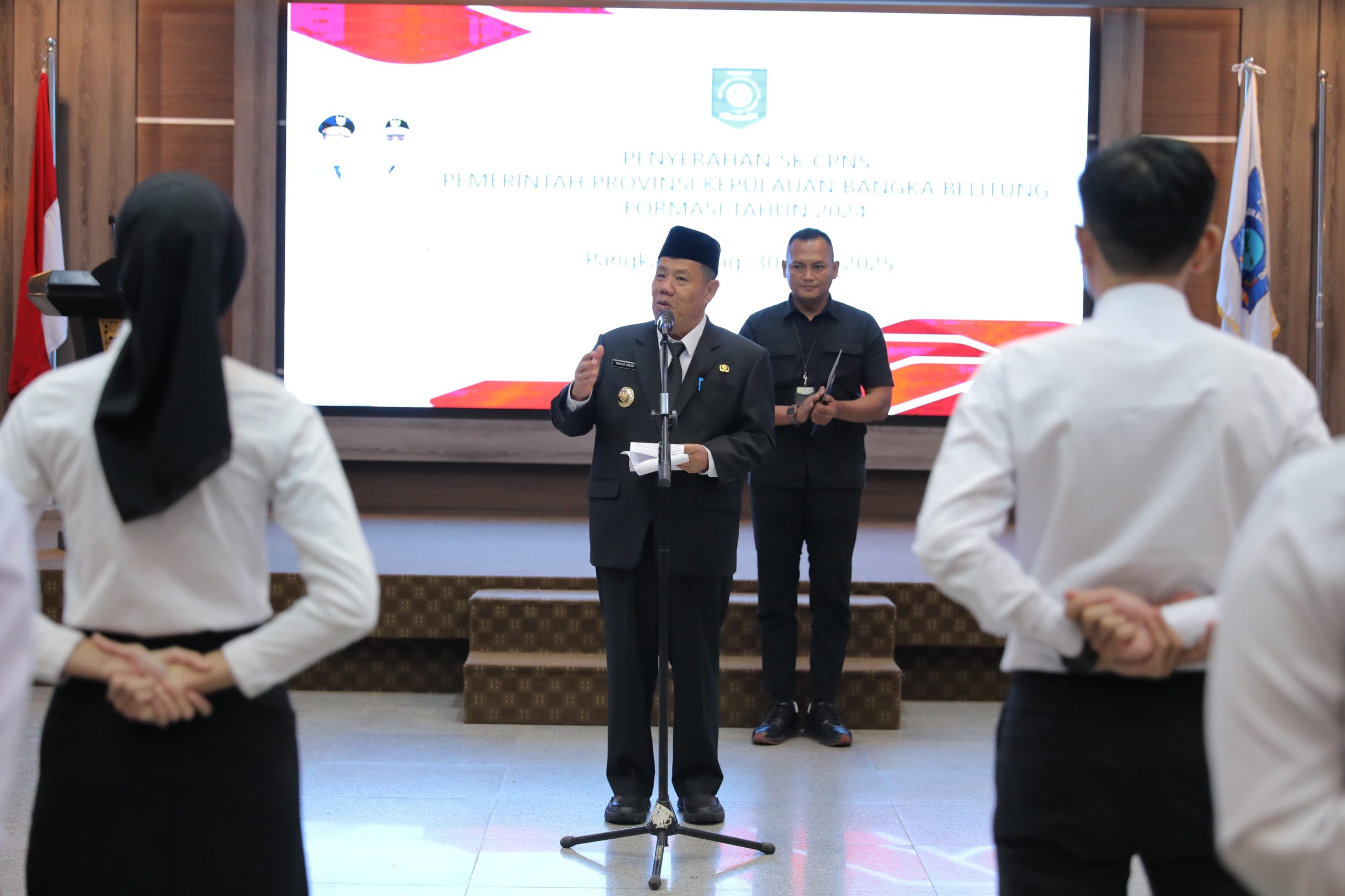 PANGKALPINANG – 38 Calon Pegawai Negeri Sipil di Lingkungan Pemerintah Provinsi Kepulauan Bangka Belitung (Pemprov. Kep. Babel) menerima Surat Keputusan (SK) pengangkatan CPNS. Pembagian SK ini dilakukan di Ruang Pasir Padi Kantor Gubernur Babel oleh Gubernur Hidayat Arsani pada Rabu (30/4/2025).