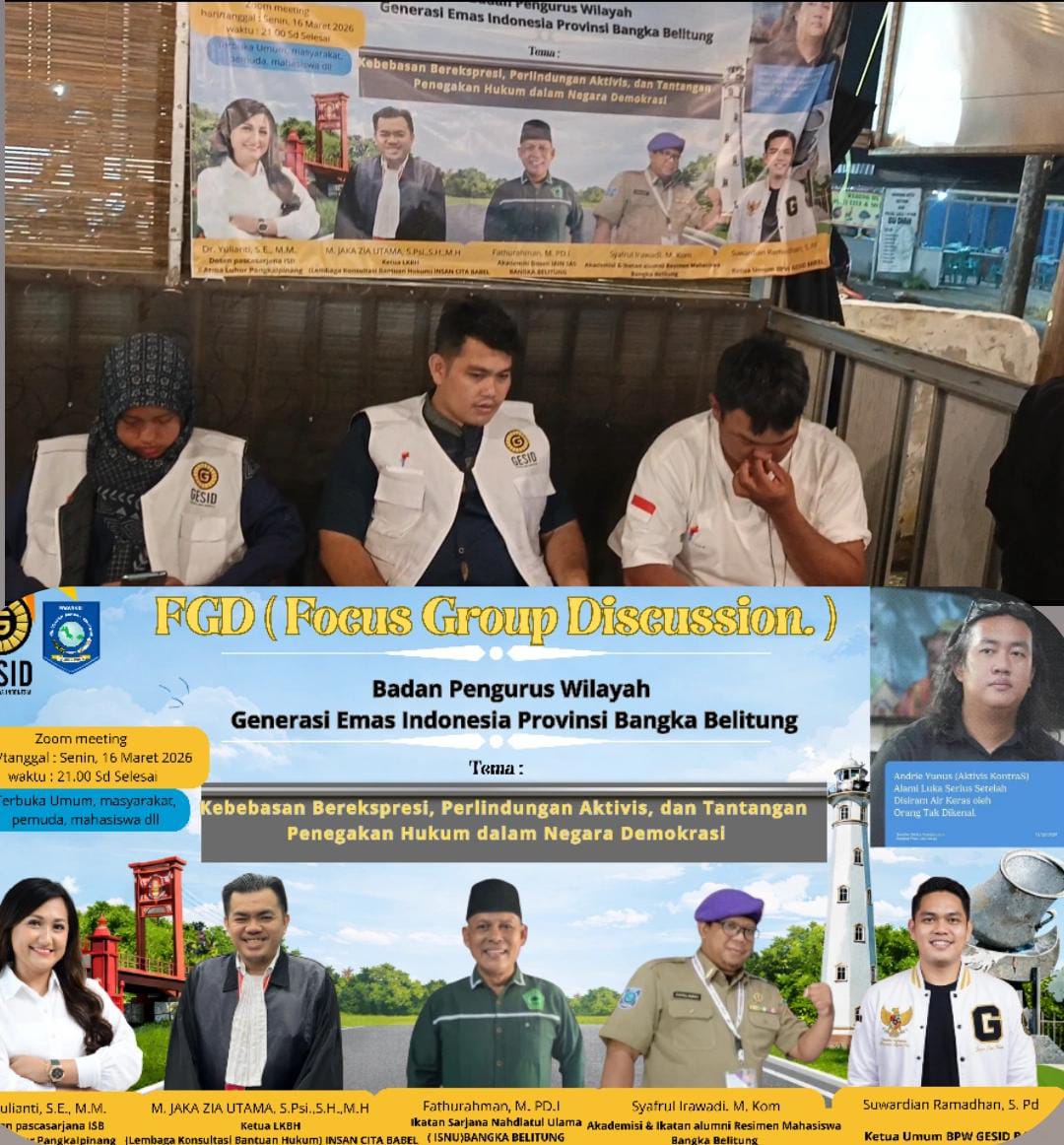 PANGKALPINANG – Badan Pengurus Wilayah (BPW) Generasi Emas Indonesia (GESID) Provinsi Bangka Belitung menggelar Focus Group Discussion (FGD) secara virtual melalui Zoom Meeting pada Senin malam, 16 Maret 2026, pukul 21.00 WIB. Diskusi ini dilaksanakan dari Warung Kopi OWL Kota Pangkalpinang dan diikuti oleh sekitar 45 peserta dari kalangan pemuda, mahasiswa, serta masyarakat umum.